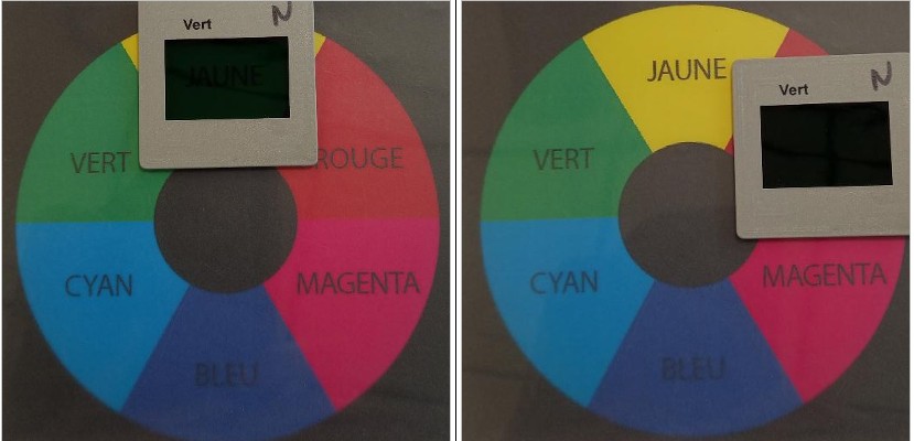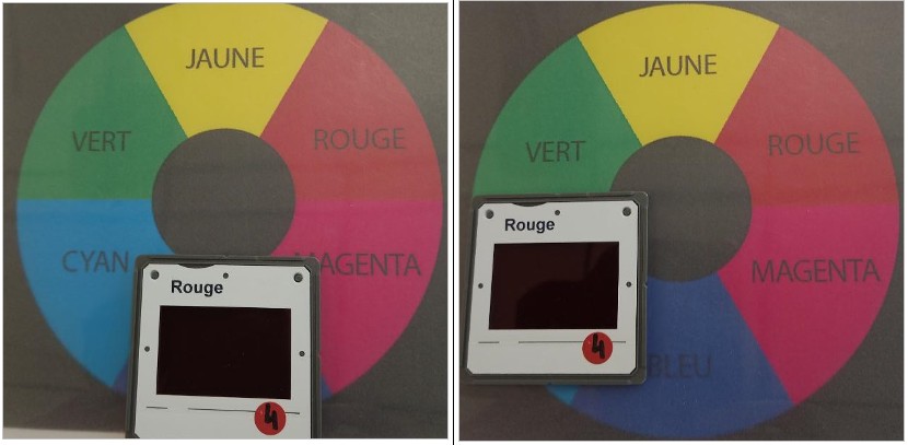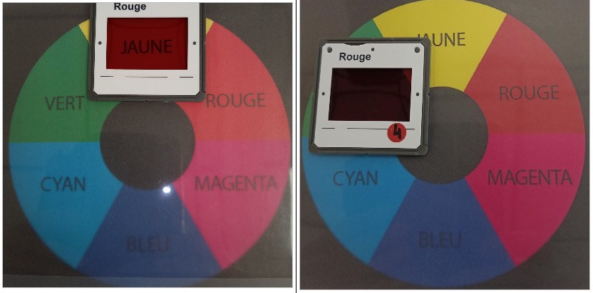 L’expérience a consisté à observer à travers des filtres colorés (qui simulent l’effet des lumières de l’enseigne) l’apparence de différents secteurs colorés imprimés sur une feuille de papier.